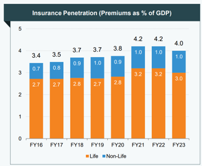 In FY 2023, India’s total insurance premiums amounted to 4% of GDP: